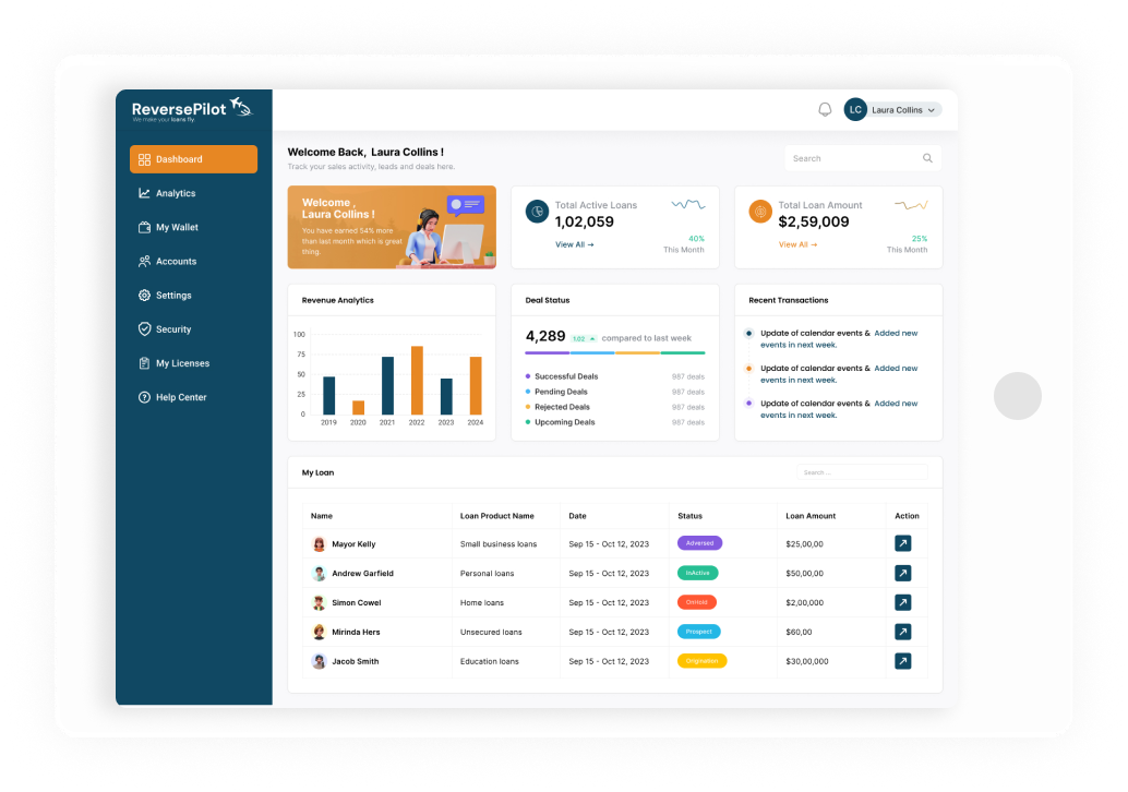 ReversePilot navigates every phase of the reverse mortgage process, ensuring seamless communication and efficiency from sales through to post-closing. Our all-in-one solution is the co-pilot your team needs to soar above the competition, delivering exceptional service and ensuring compliance every step of the way.